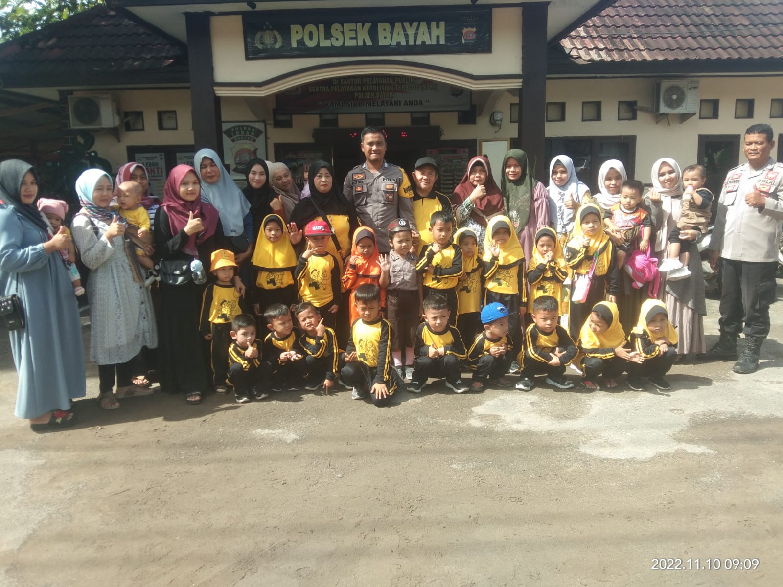 Kunjungan langsung diterima Oleh Kanit Binmas Polsek Bayah Polres Lebak Bripka Sutardi (Kanit Binmas) dan Anggota Polsek Bayah, kegiatan ini sebagai program Kunjungan Akademik ( Studi Lapangan )  dalam kegiatan tersebut di berikan pemahaman dan pengenalan kepada anak-anak Taman Kanak Kanak  tentang tugas polri di setiap unit, ruangan setiap unit kerja polri dan pengenalan rambu rambu lalu lintas.