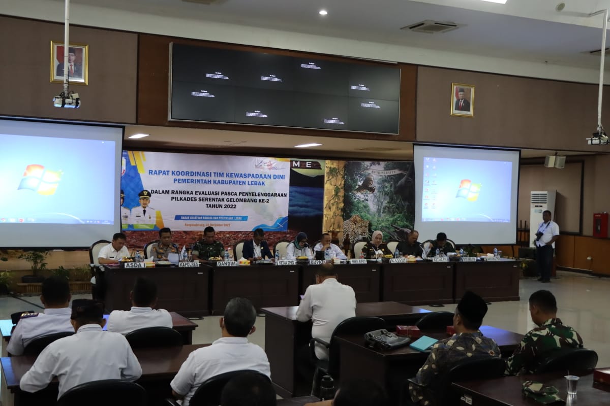 Rapat Koordinasi Tim Kewaspadaan Dini Pemerintah Kabupaten Lebak dalam rangka Evaluasi Pasca Penyelenggaraan Pilkades Serentak Gelombang ke-2 Tahun 2022 yang di pimpin oleh Bupati Lebak Hj. Iti Octavia Jayabaya,SE,MM. dan dihadiri Kapolres Lebak AKBP Wiwin Setiawan, SIK, MH, Kabag Ops Polres Lebak Kompol Eddy Prasetyo,H,SE, Forkopimda Lebak dan Para Kepala OPD Pemda Lebak.