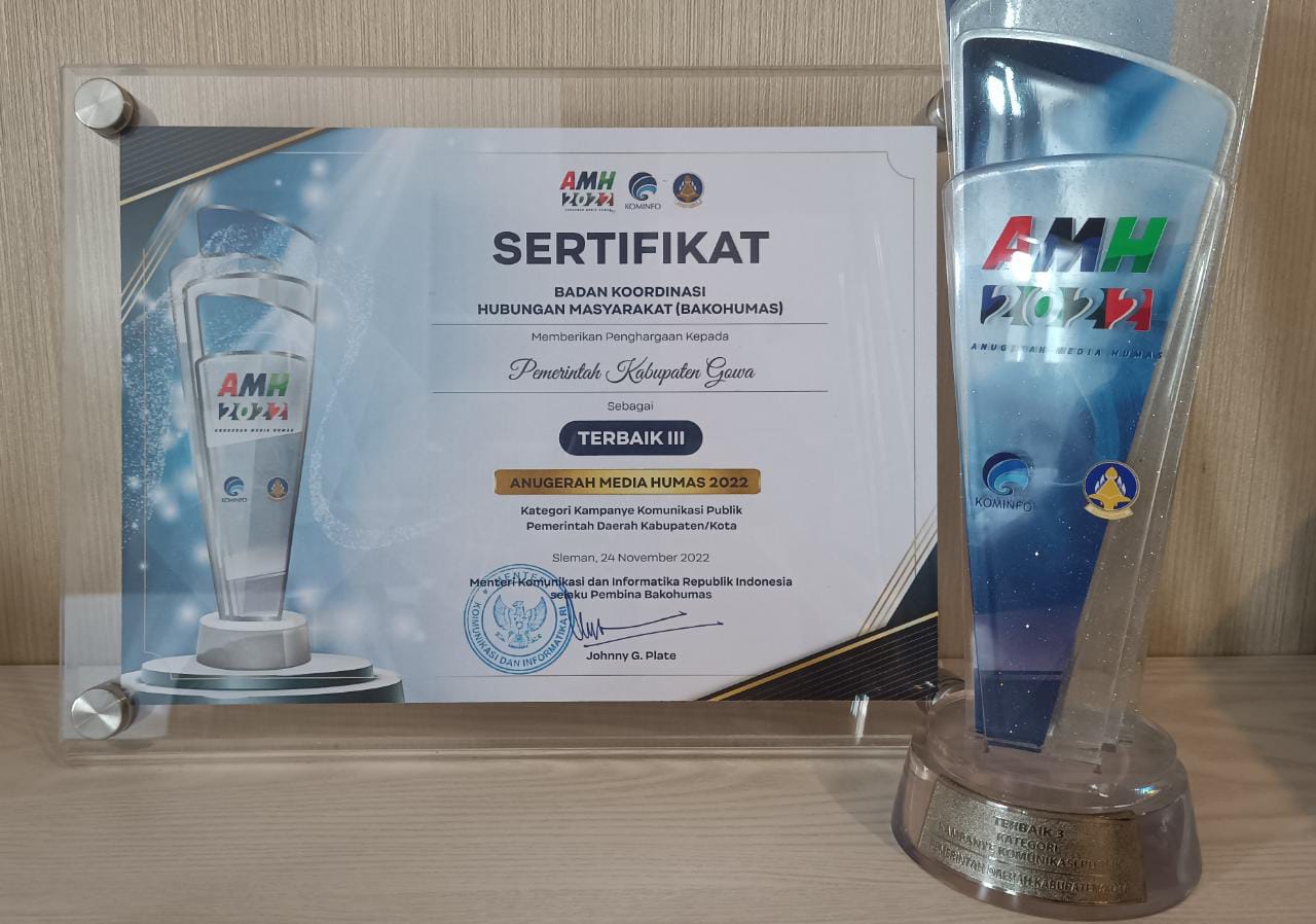 Penghargaan Terbaik III Kategori Kampanye Komunikasi Publik Pemerintah Daerah Kabupaten/Kota ini diterima langsung Kepala Dinas KominfoSP Kabupaten Gowa, Arifuddin Saeni di Kraton Grand Ballroom, Jogjakarta Marriot Hotel, Jogjakarta, (25/11/2022).