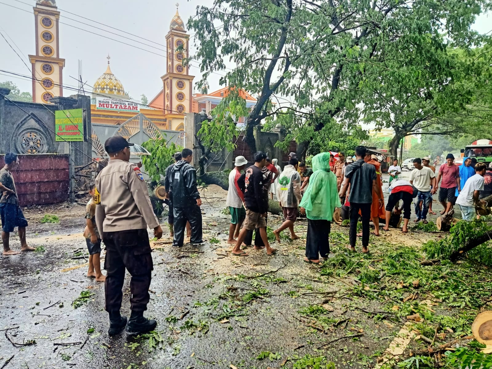 Bersama warga polisi evakuasi pohon tumbang yang menghalangi jalan lintas provinsi