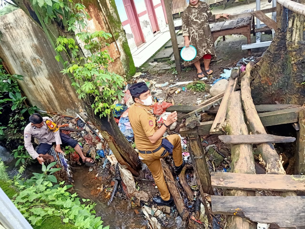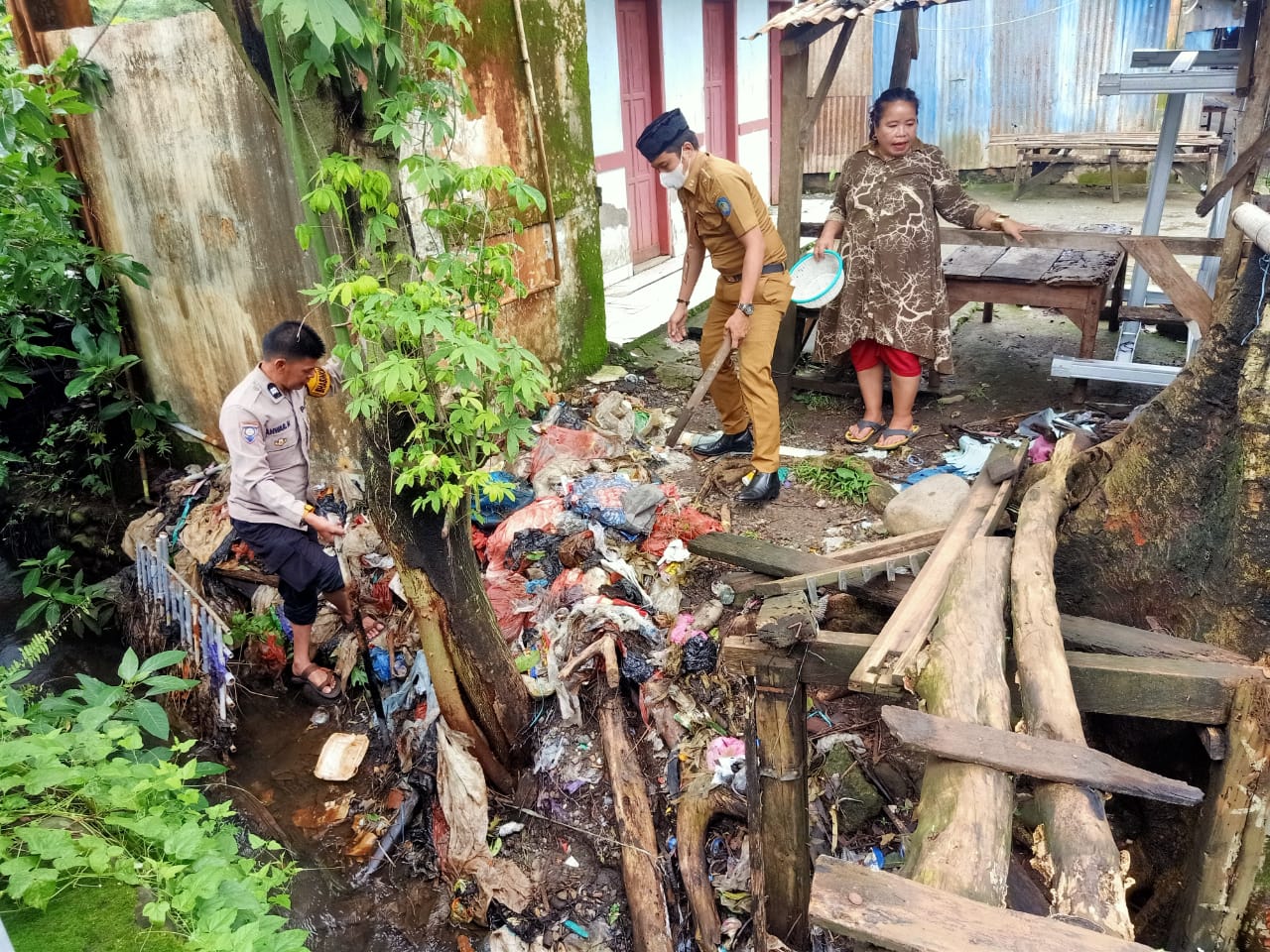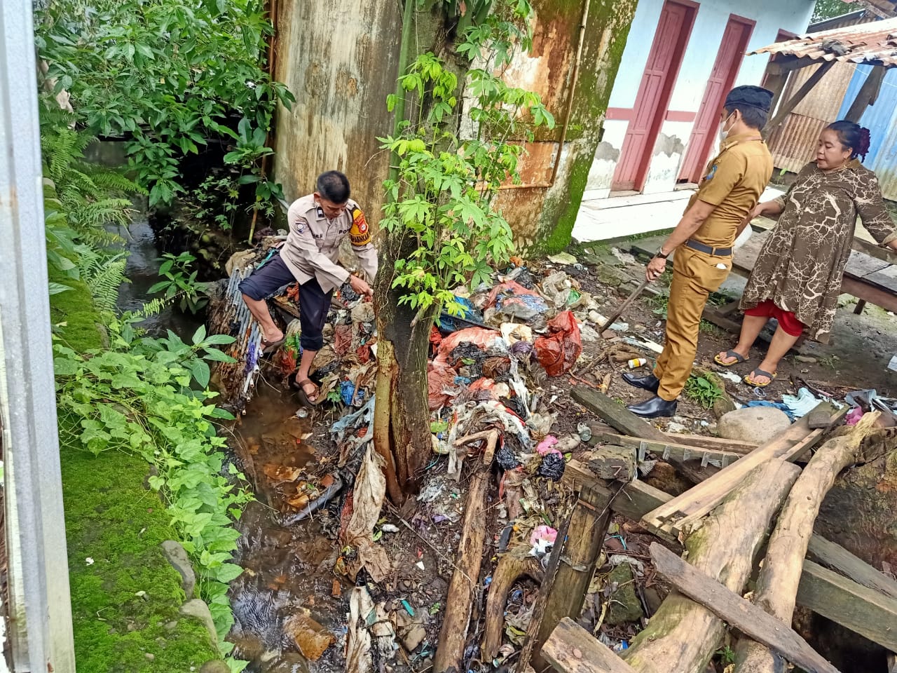 Dalam kesempatan itu Aiptu Anwar Nangga turun langsung mengangkat sampah yang berada di saluran air got yang menyumbat aliran air yang dapat memicu terjadinya banjir.