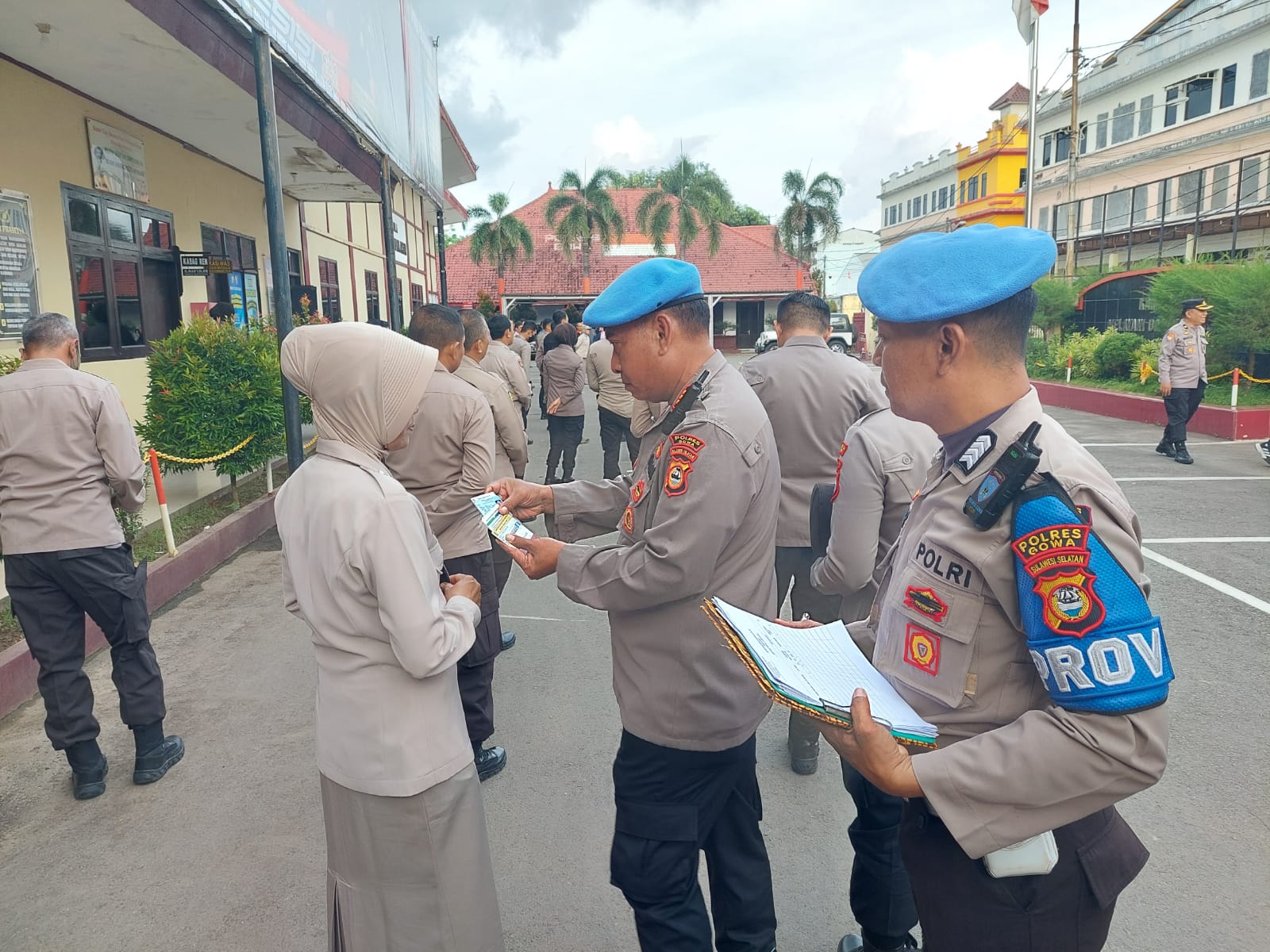 Wakapolres didampingi Kasi Propam, terlihat melakukan pemeriksaan setiap anggota meliputi sikap tampang, pemakaian seragam dinas, kelengkapan identitas diri anggota mulai dari KTP, KTA, SIM serta surat-surat kendaraan bermotor dinas.
