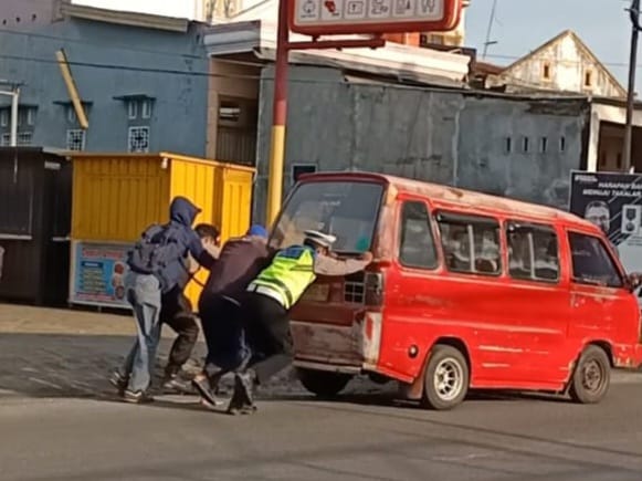 Star7 Tv -Takalar-Apa yang dilakukan oleh anggota Polisi Satuan Lalulintas Polres Takalar Polda Sulawesi Selatan saat membantu mendorong angkot yang mogok di jalan P. Diponegoro mendapat pujian dari warga yang melihat aksi tersebut.