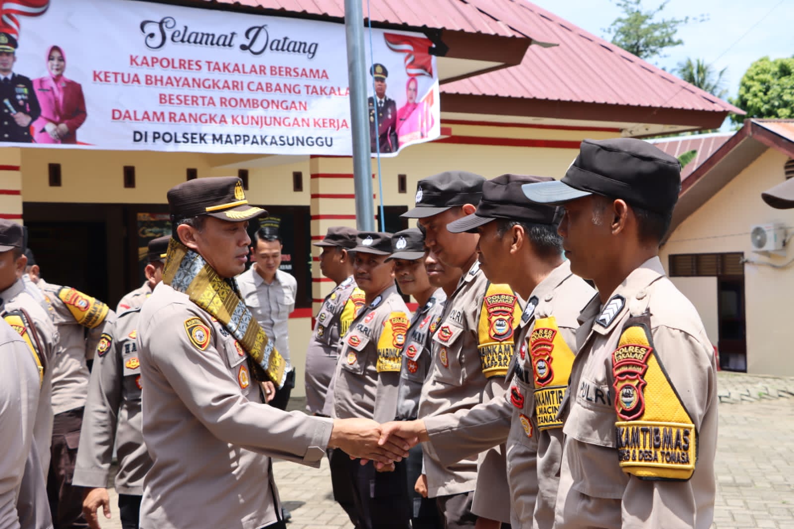Didampingi ibu Ketua Bhayangkari Cabang Takalar Ny. Dewi Gotam Hidayat beserta Ketua Seksi Bhayangkari Cabang Takalar, kali ini Kapolres beserta PJU melaksanakan kunjungan kerja ke Polsek Mapsu, Kecamatan Mappakasunggu, Kabupaten Takalar Sulawesi Selatan.