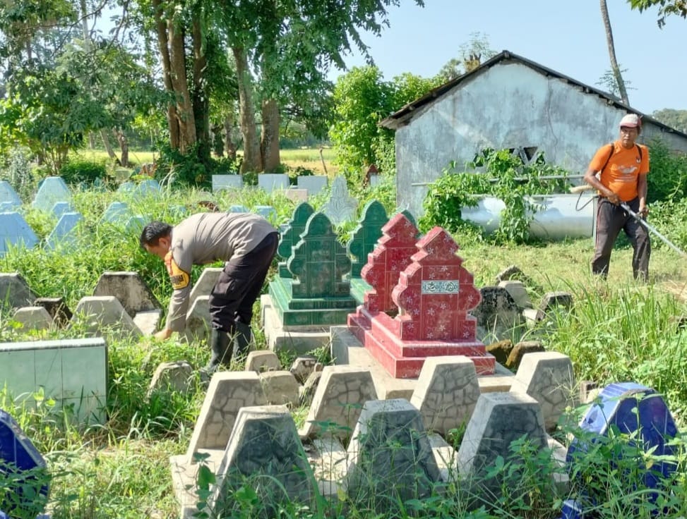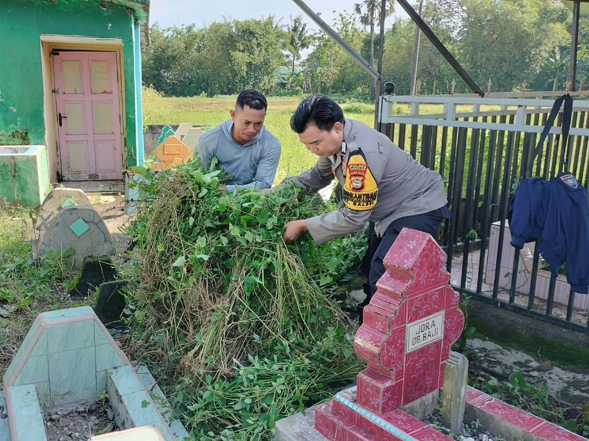 Bersama Masyarakat, Bhabinkamtibmas Gotong Royong Bersihkan TPU