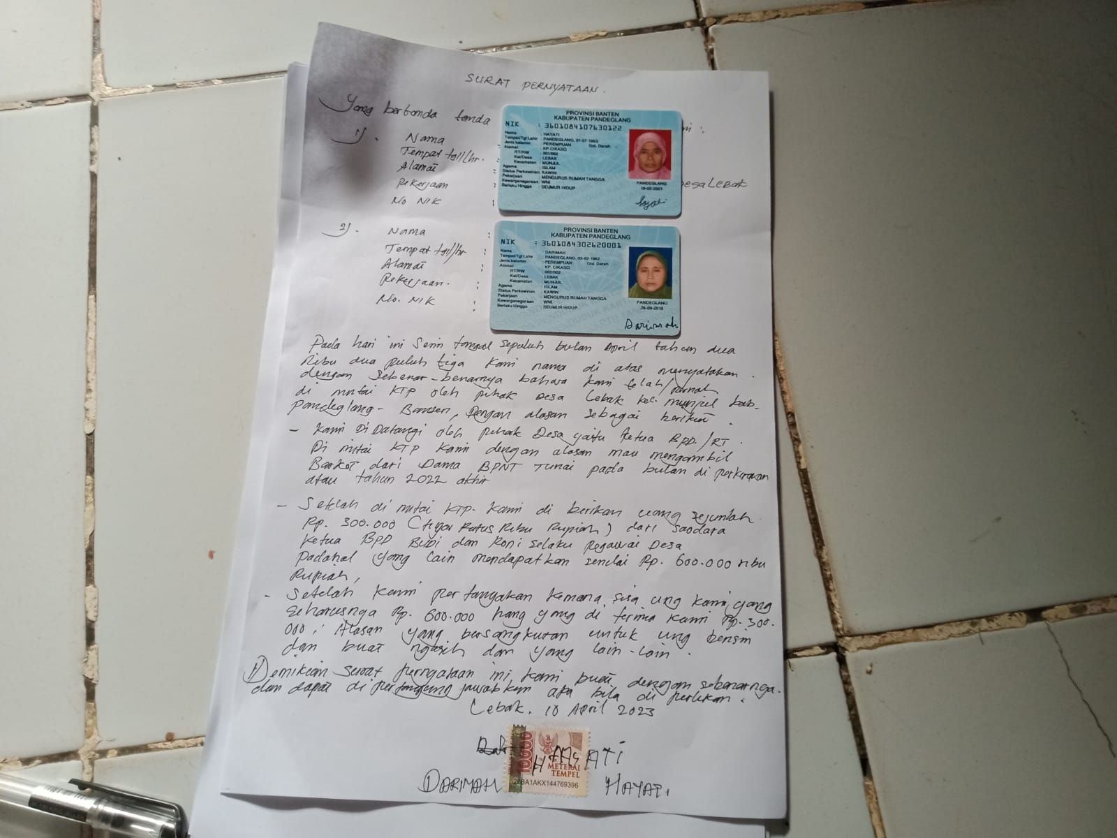 Sementara (Budi-red) selaku ketua BPD Desa Sadar Lebak saat di komfirmasi telpon WhatsApp hari itu juga dengan nada mengelak dan mengatakan” iya pak saya yang ngambil KTP kepada warga saya karena saya mau menolong warga saya biar bisa di cairkan di kantor pos setelah di cairkan oleh kami saya berikan kepada KPM tersebut senilai Rp.400 ribu rupiah karna kita juga harus memberi kepada pihak pos senilai Rp.100 ribu rupiah/KPM dan sisa rp.500 ribu saya berikan rp.400 ribu rupiah kepada para KPM ” kata Budi