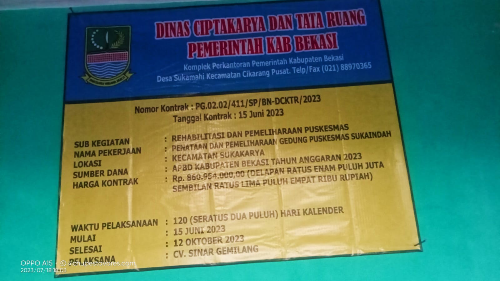 Salah satu nya yang mendapat rehabilitasi dan pemeliharaan Puskesmas Desa Sukaindah Kecamatan Sukakarya Kabupaten Bekasi. Namun ironisnya kegiatan tersebut saat pekerjaan berjalan tanpa ada pengawasan pelaksana lapangan, untuk mengawasi dan mengkoordinasikan pekerjaan.