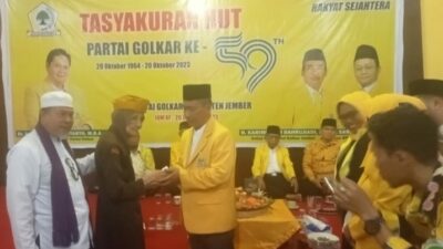 “Alhamdulillah, hari ini Partai Golkar Jember yang Insya Allah secara serentak se Indonesia di dalam rangka melakukan HUT Partai Ke 59. Ini waktu yang cukup panjang bagi Partai Golkar. ” Terang H. Karimullah.