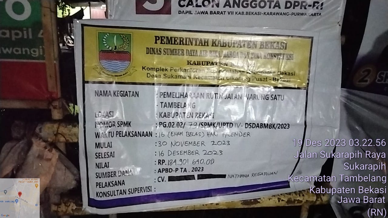 Star7Tv.com — Kabupaten Bekasi — Pekerjaan Pengaspalan Jalan Warungsatu Tambelang yang dilaksanakan oleh rekanan Dinas Sumberdaya Air, Binamarga dan Bina Konstruksi (DSDABMBK) Kabupaten Bekasi yaitu CV. Nathania Regaruan, Dikeluhkan DPC AWIBB Bekasi Raya, Pada Selasa dini hari (19/12/2023).