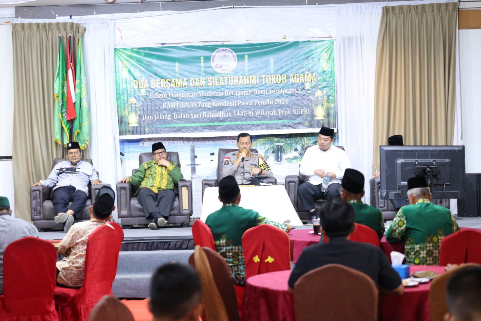 Star7tv.com Batam– Kabid Humas Polda Kepri Kombes. Pol. Zahwani Pandra Arsyad, S.H. M.Si., hadiri kegiatan “Doa Bersama dan Silaturahmi Tokoh Agama dalam Penguatan Moderasi Beragama demi terciptanya Kamtibmas yang Kondusif Pasca Pemilu 2024 dan jelang Bulan Suci Ramadhan 1445 di Wilayah Prov Kepri” sekaligus menjadi pemateri di Ball Room Hotel Golden Prawn, Kota Batam. Sabtu (9/3/2024).