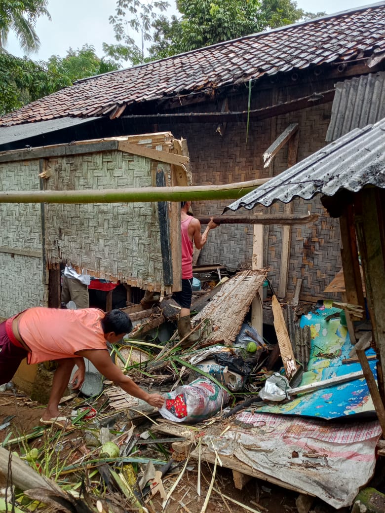 Rumah yang tertimpah pohon kelapa milik bpk karna dan ibu Jeni. Peristiwa tersebut menyebabkan kerusakan pada bagian atep rumah dan yang lainnya. Proses pembersihan di lakukan secara gotong royong oleh warga sekitar yang turun langsung membantu membersihkan pohon kelapa yang tumbang