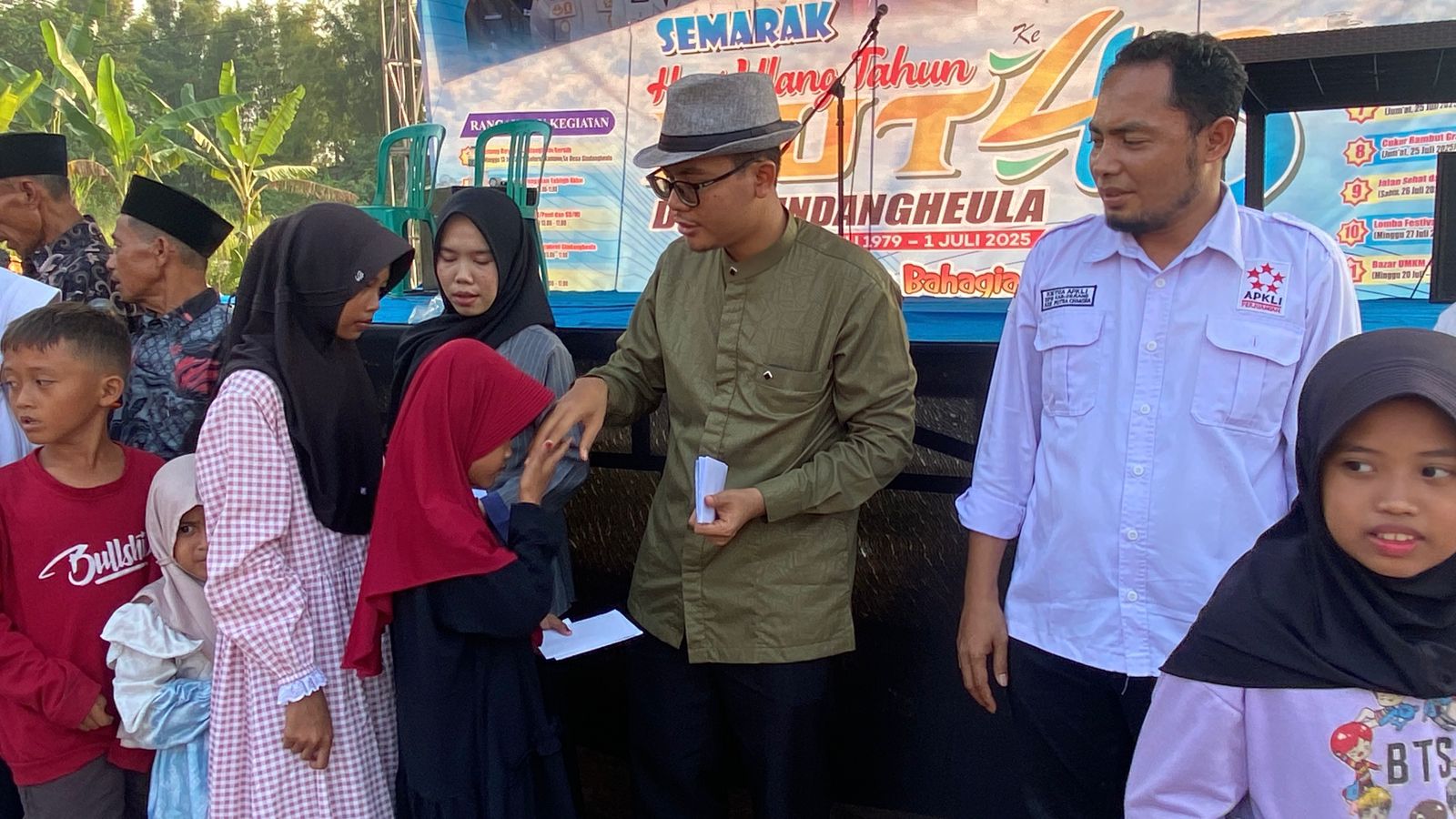 Serang,25-7-2025 Dalam rangka memeriahkan Hari Ulang Tahun (HUT) ke-46 Desa Sindangheula, Kecamatan Pabuaran, Kabupaten Serang, Asosiasi Pedagang Kaki Lima Indonesia (APKLI) Kabupaten Serang bersama Pemerintah Desa Sindangheula berikan santunan kepada puluhan anak yatim dan mengajak anak-anak yatim untuk menikmati wahana bermain secara gratis di area pasar malam desa Sindangheula, Jumat (25/7/2025).