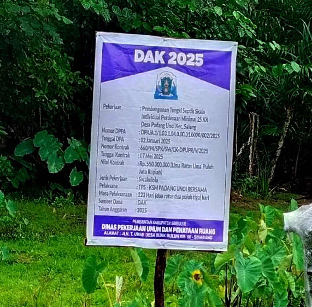 Simeulue, 31 Juli 2025 – Proyek pembangunan WC/tangki septik skala individual perdesaan di Desa Padang Unoi, Kecamatan Salang, Kabupaten Simeulue, yang dibiayai melalui Dana Alokasi Khusus (DAK) tahun anggaran 2025 sebesar Rp550 juta, menuai sorotan publik. Proyek yang diperuntukkan bagi sedikitnya 25 kepala keluarga (KK) ini diduga tidak dilaksanakan sesuai prinsip transparansi dan mekanisme swakelola yang ditetapkan pemerintah.