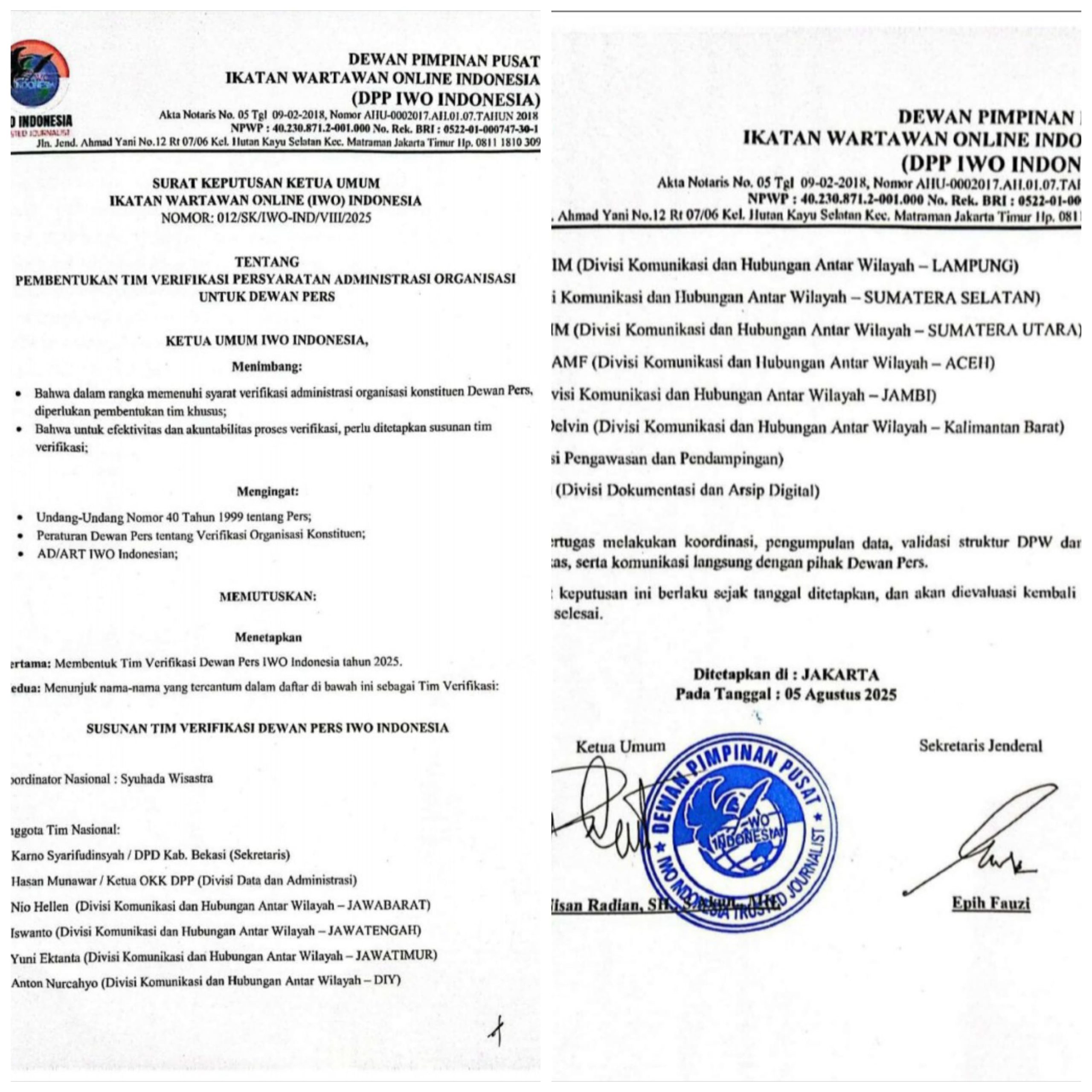Banda Aceh, 19/8/2025 – Ikatan Wartawan Online Indonesia (IWOI) resmi terdaftar di Dewan Pers pada Juli 2025. Menindaklanjuti proses tersebut, Dewan Pimpinan Pusat (DPP) IWO Indonesia telah mengeluarkan Surat Keputusan (SK) dengan nomor 012/SK/IWO-IND/VIII/2025 yang menunjuk 14 orang untuk mempersiapkan kelengkapan verifikasi organisasi.