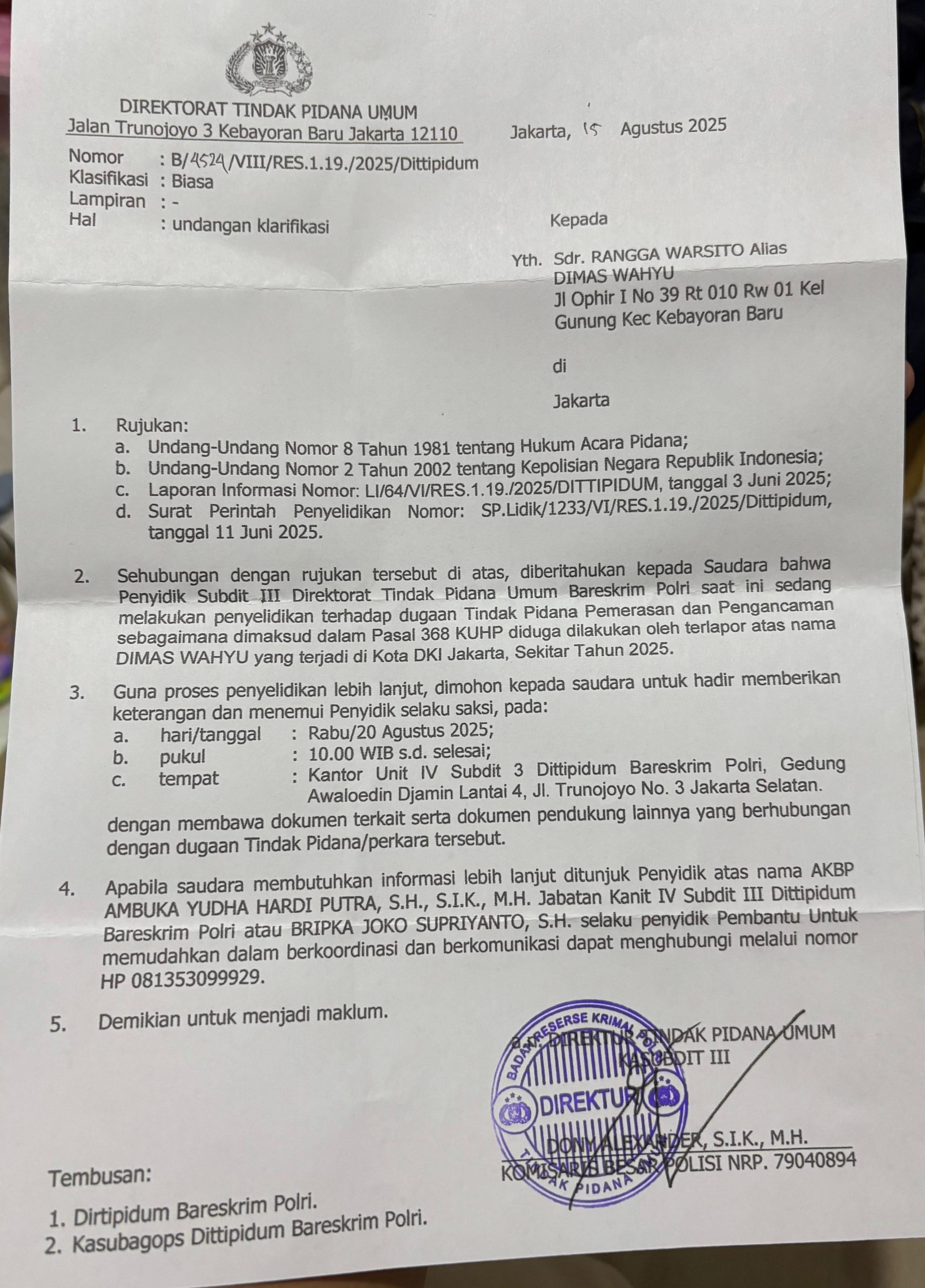 Jakarta, 20 Agustus 2025 — Star7Tv.com — Dimas Wahyu (Ketua LBH Harimau Raya) tengah mendatangi Kantor Mabes Polri – Unit IV Subdit 3 Lantai 4 Dittipidum Mabes Polri – Trunojoyo Jakarta Selatan terkait adanya Laporan Informasi/ DUMAS Kepada DITTIPIDUM Mabes Polri, Dengan nomor Surat Laporan Informasi : LI/64/VI/Res.1.19/2025/DITTIPIDUM tanggal 3 Juni 2025 atas Nama pelapor Sdr. Minardi (Mantan Pemeriksa Pajak Kanwil Jakarta Timur) dan Penasihat hukumnya, Terkait dugaan Pemerasan dan Pencemaran nama baik yang dilakukan atas nama Terlapor Dimas Wahyu (Ketua LBH Harimau Raya) pada tahun 2025.
