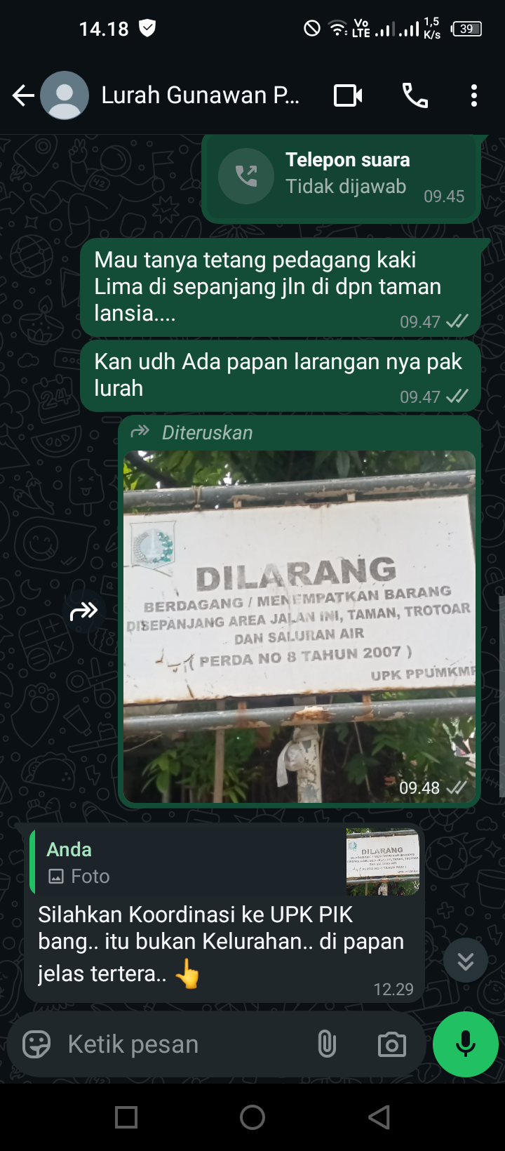 Akhirnya kami pun mencoba menghubungi melalui telepon seluler by Wa kepada bapak lurah penggilingan untuk mempertanyakan plang larangan perda yg terpasang di dalam Perkampungan industri kecil terkait pedagang kaki lima