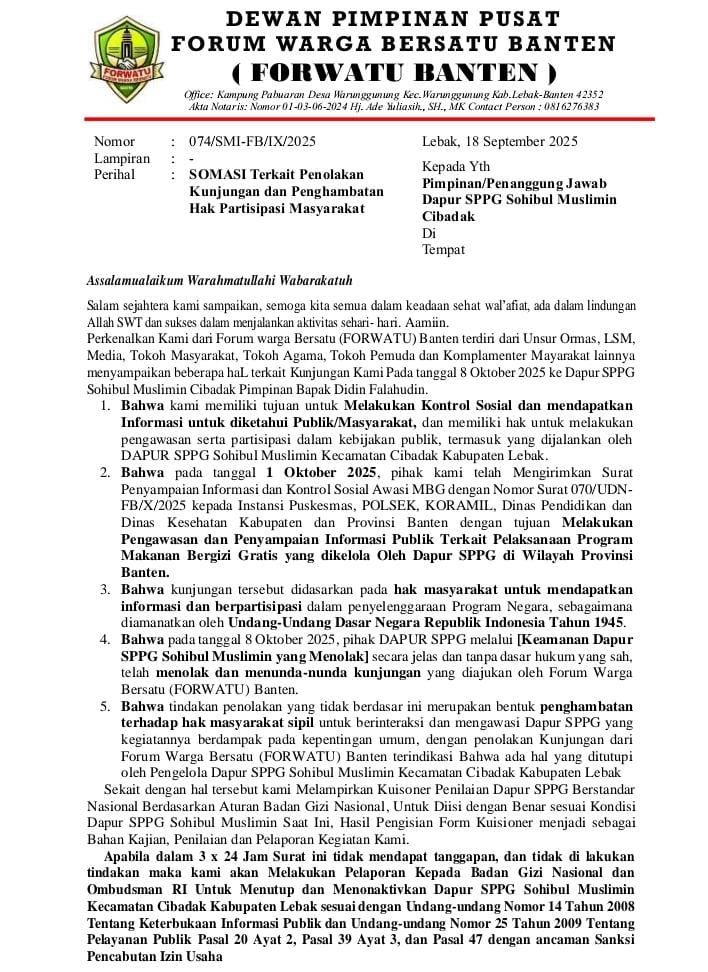 Banten, star7tv.com. 10 oktober 2025. Surat Somasi bernomor 074/SMI-FB/IX/2025 dilayangkan oleh Forum Warga Bersatu (Forwatu) Banten, sebagai tindak lanjut dari hasil investigasi yang dilakukan oleh Tim Khusus Awasi MBG Forwatu Banten.