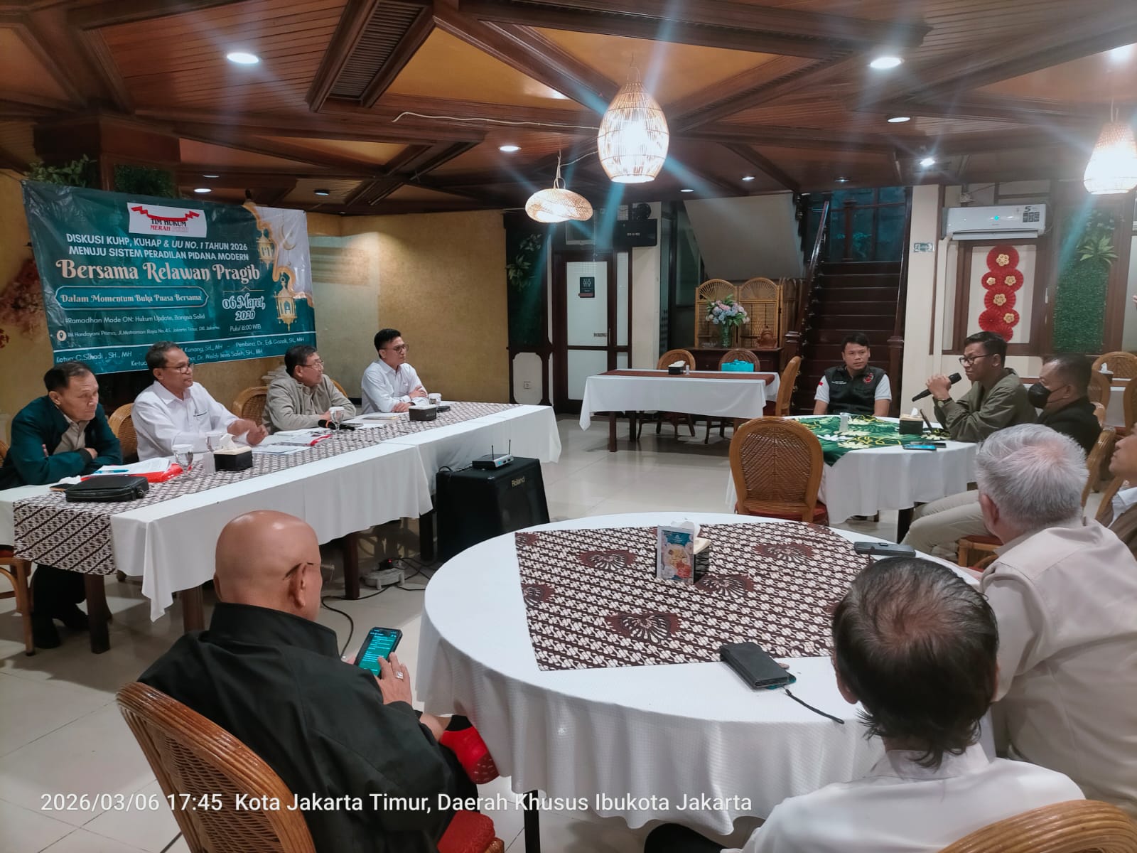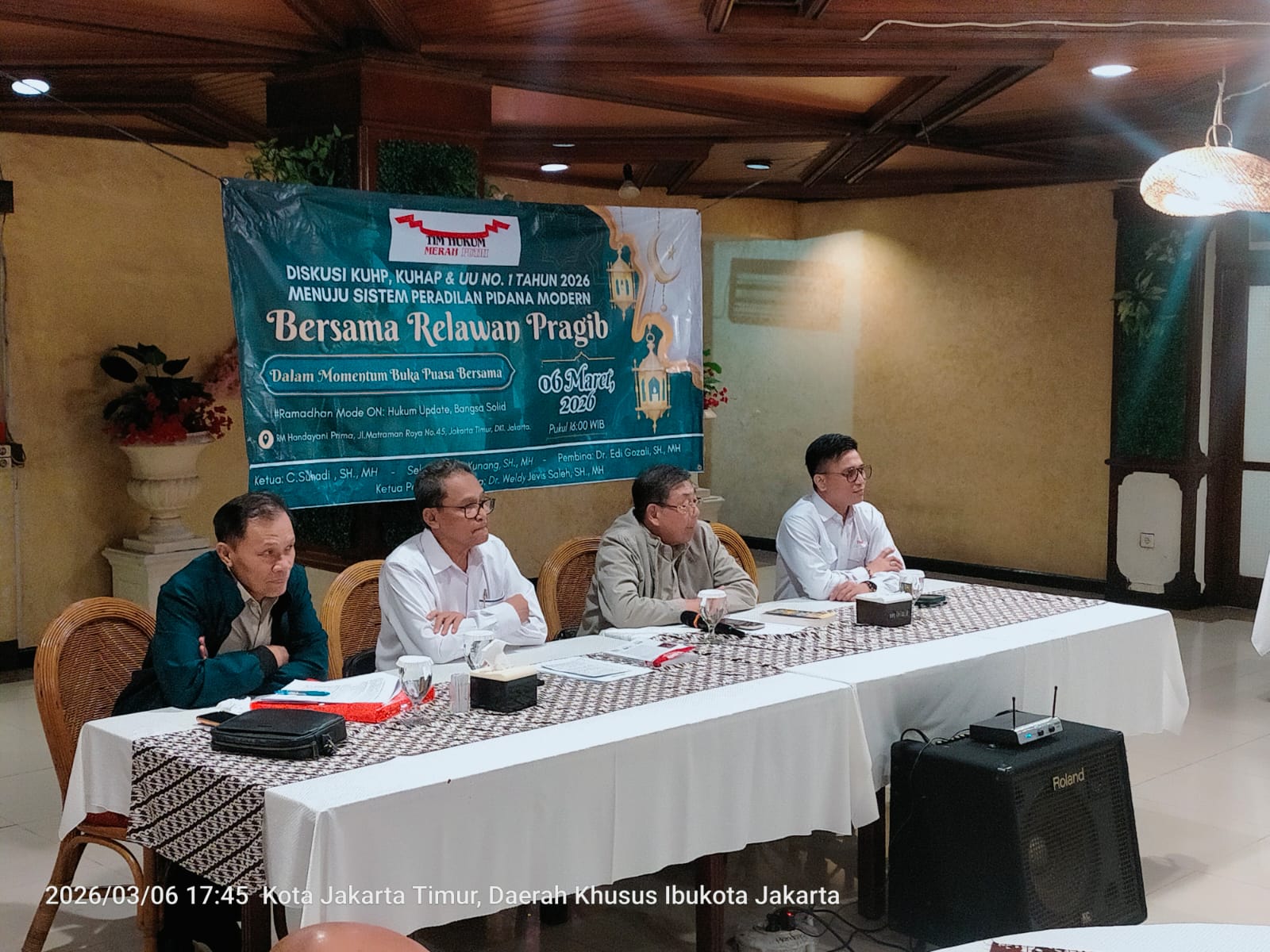JMPN – Jakarta – Tim Hukum Merah Putih bersama Relawan Pragib menggelar kegiatan diskusi hukum yang membahas pembaruan KUHP, KUHAP, serta Undang-Undang Nomor 1 Tahun 2026 sebagai bagian dari upaya menuju sistem peradilan pidana yang modern di Indonesia. Kegiatan tersebut dilaksanakan di RM Handayani Prima, Menteng, Jakarta, pada pukul 16.00 WIB hingga selesai.(6/3/2026)